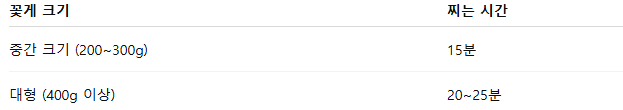 꽃게 찌는 방법의 실패 원인 1위는 ‘과하게 찌는 것’입니다. 살이 퍽퍽해질 수 있으므로 꼭 타이머를 맞추세요.뜸 들이기